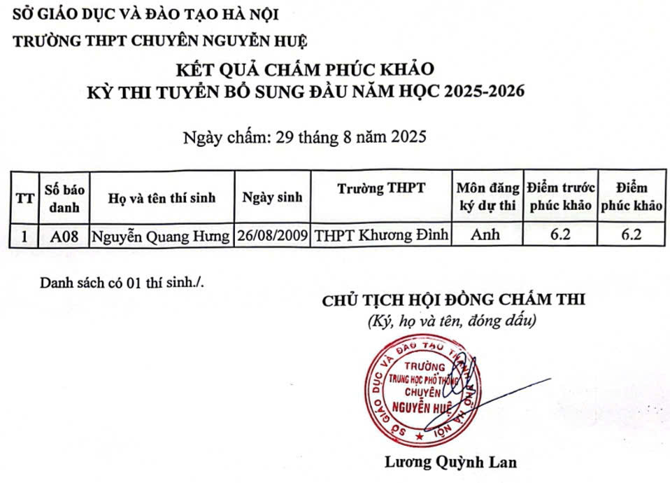 KẾT QUẢ CHẤM PHÚC KHẢO KỲ THI TUYỂN BỔ SUNG ĐẦU NĂM HỌC 2025 - 2026