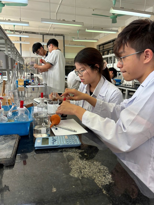 Điểm nhấn của cuộc thi nằm ở phần thí nghiệm chuẩn độ Fe(II) bằng dung dịch thuốc tím (KMnO4). Đây là phần thi đòi hỏi sự kiên nhẫn và độ chính xác tuyệt đối trong từng giọt dung dịch để xác định điểm tương đương. Những gương mặt tập trung cao độ, những thao tác điều chỉnh khóa buret nhịp nhàng đã tạo nên một hình ảnh đẹp về sự nghiêm túc trong nghiên cứu khoa học của học sinh Chuyên Nguyễn Huệ.
