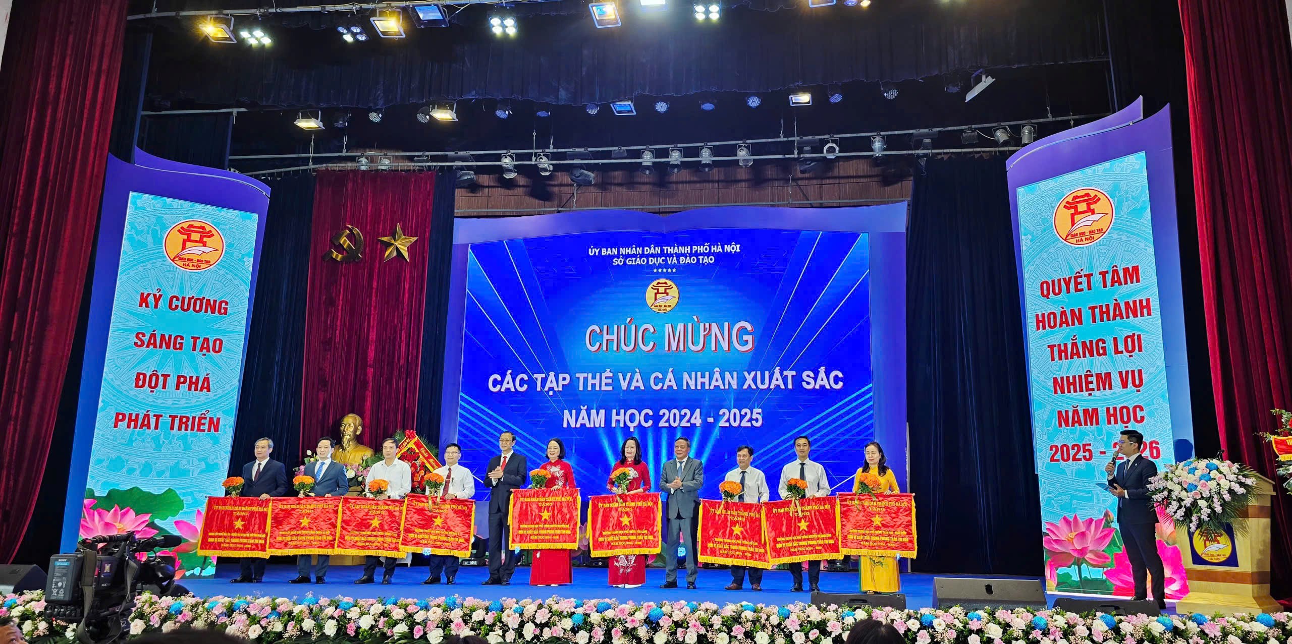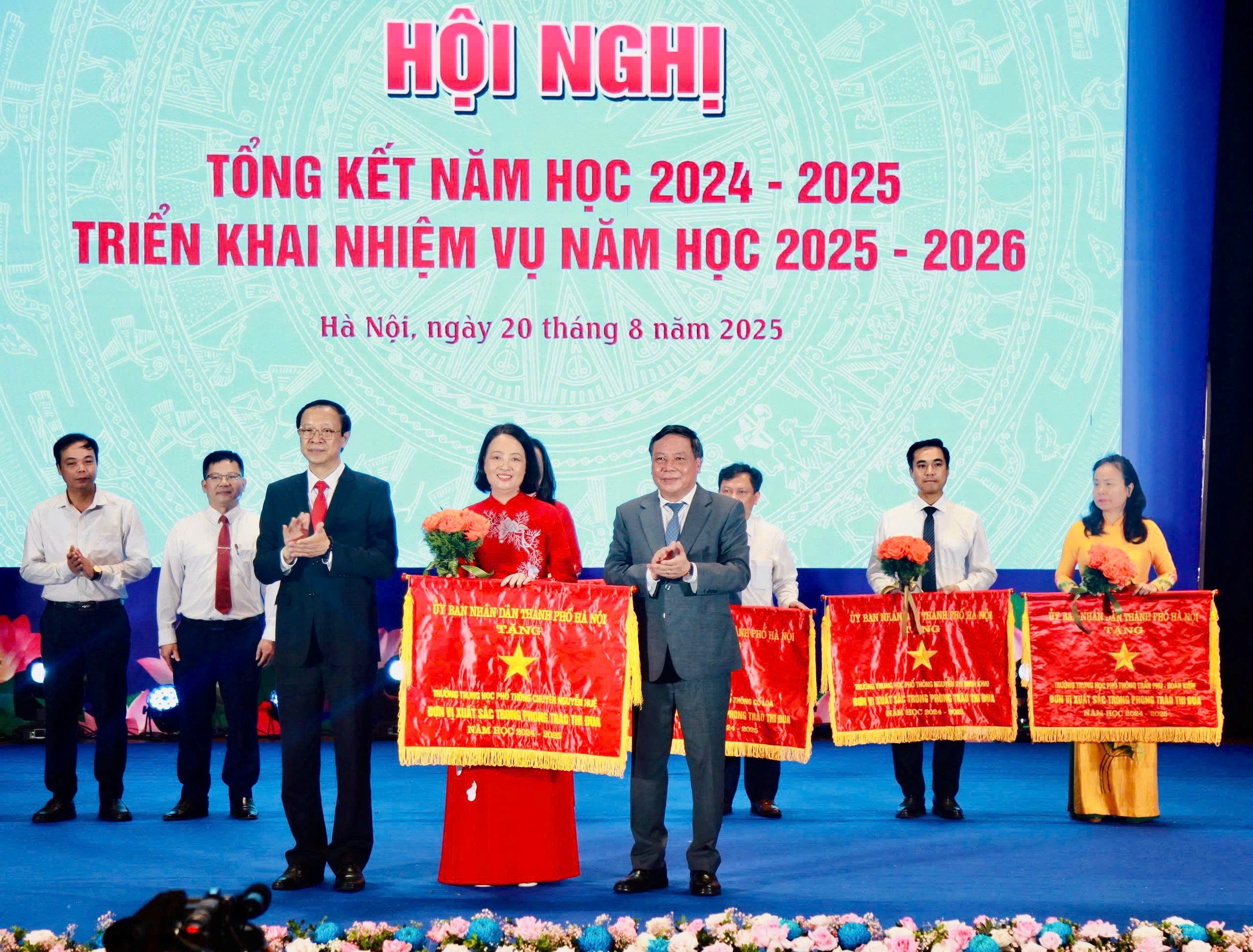 Phó Bí thư Thường trực Thành ủy Nguyễn Văn Phong cùng Thứ trưởng Bộ Giáo dục và Đào tạo Phạm Ngọc Thưởng trao cờ “Đơn vị xuất sắc trong phong trào thi đua” của UBND thành phố Hà Nội tặng 9 đơn vị trong đó có Trường THPT chuyên Nguyễn Huệ.